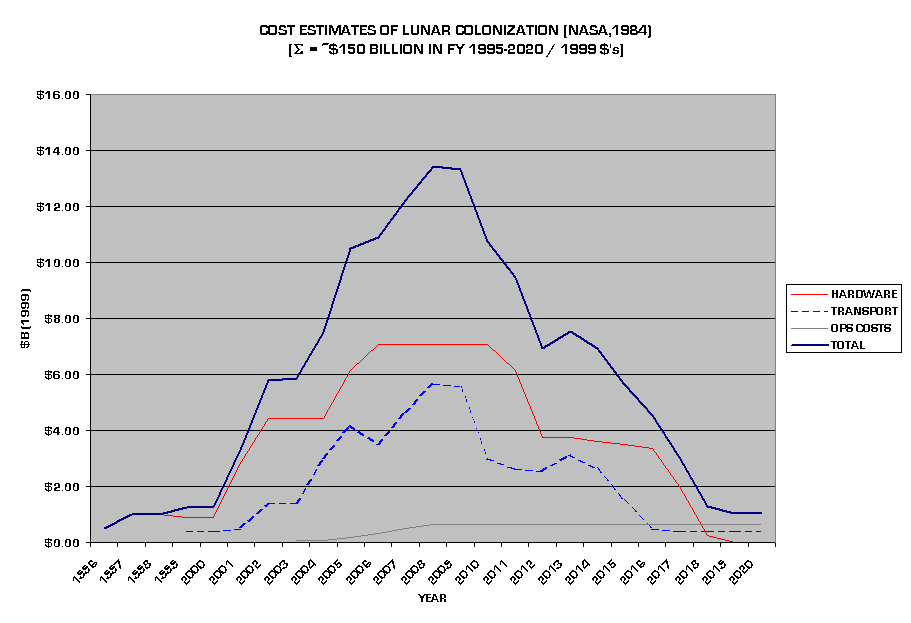 The total cost [1999 $'s] of the undertaking is shown in the table+graph below. This "Lunar